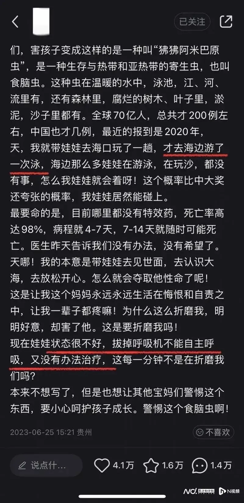 无独有偶,2023年6月,贵州一名孩子家长在网上持续记录自己孩子生病就医的经历。据说孩子去海边游了一次泳,竟感染了罕见的“阿米巴原虫”,俗称“食脑虫”。最要命的是,这个病目前没有特效药,死亡率极高,堪称“超级杀手”。