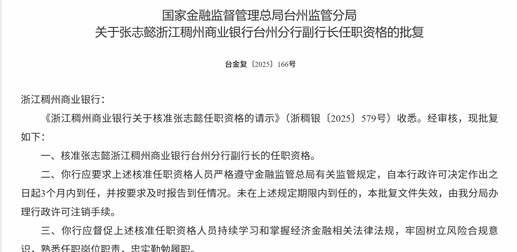 12月3日配资炒股之家,国家金融监督管理总局台州监管分局发布关于张志懿浙江稠州商业银行台州分行副行长任职资格的批复,核准张志懿浙江稠州商业银行台州分行副行长的任职资格。