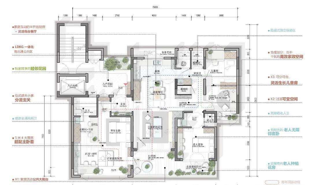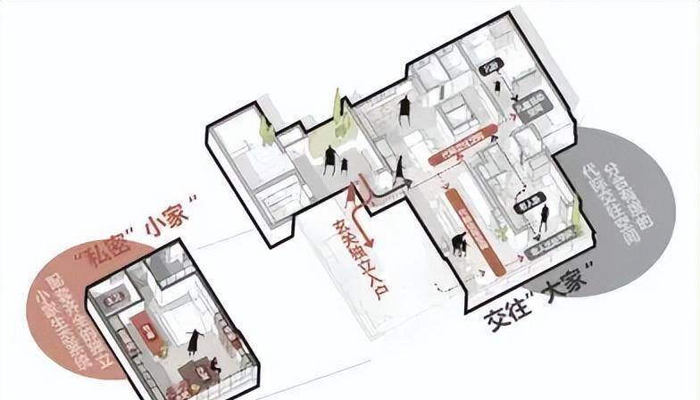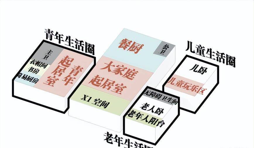 比如:老人与年轻夫妻分开布局,中间用客厅、公区隔开,彼此生活动线互不干扰, 既像住在一起,又像住在两套房里