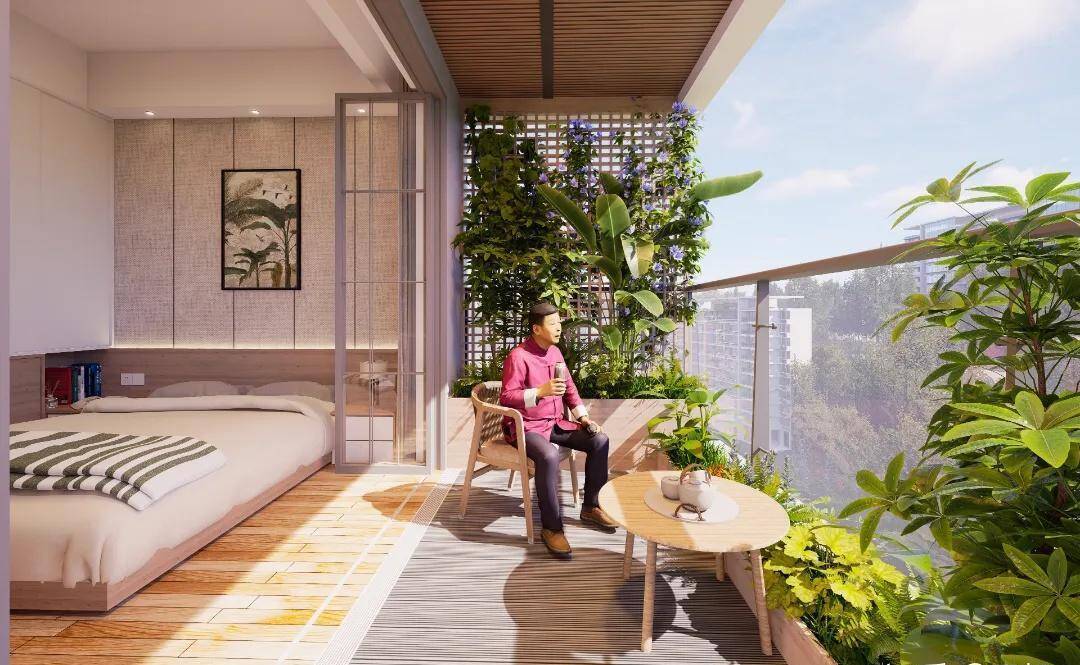 老人房的空间,不仅能轻松放下两张单人床,还能把旁边的阳台打造成:小花园/晾晒区/早晨晒太阳喝茶的小天地。
