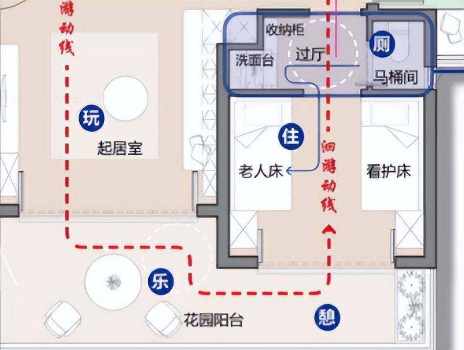 什么意思?就是如果把动线轻轻一隔,年轻夫妻的主卧小套,就能形成半独立生活圈,几乎具备“一室一厅”的功能。